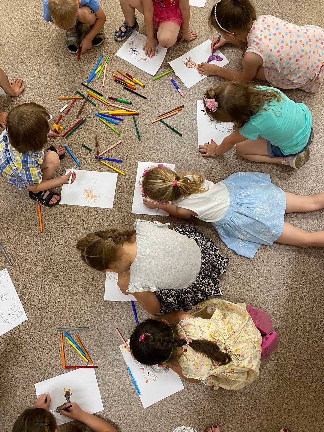 The organization consistently extends humanitarian aid and organizes educational and creative master-classes for children residing in cities near war zones and de-occupied territories. Lana Ra, along with a dedicated team of volunteers, conducted over 30 meetings in the city of Kharkiv and the Kharkiv region, attracting the participation of more than 400 children. During these gatherings, humanitarian aid, in the form of creative drawing kits, was distributed.